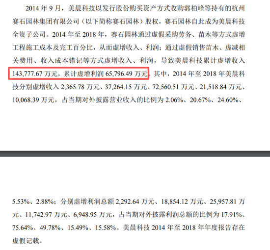 2014年至2018年,赛石园林通过虚假采购劳务、苗木等方式虚增工程施工成本及完工百分比,从而虚增收入、利润;通过虚假销售苗木、虚减相关费用、收入成本错记等方式虚增收入、利润,导致美晨科技累计虚增收入14.38亿元,累计虚增利润6.58亿元。美晨科技2014年至2018年年度报告存在虚假记载。